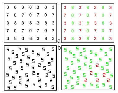 (gambar: seorang pemiliki kondisi Synesthesia yang mengaku melihat angka 2 sebagai “merah” akan bisa melihat bentuk segitiga di gambar kiri bawah dalam tempo singkat)