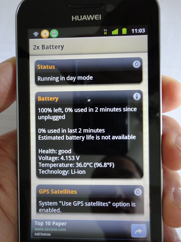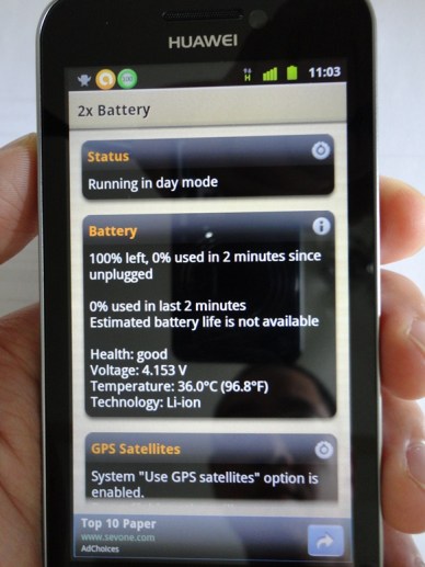 Gw harus akui – batrenya oke banget. Pertama kali gw nyoba, batre bertahan 15 jam. Buat gw 15 jam nyala udah hebat mengingat biasanya gw hrs ngecharge tiap 4-6 jam sekali. Kemudian gw dapet saran dari @rayafahreza untuk menggunakan aplikasi 2xBattery, yang bisa membantu menghemat batre. Hasilnya selama ini: bisa berkisar 16 jam (penggunaan berat: tweetnya dahsyat semalem waktu rapat paripurna DPR :p) sampe 25 jam!! Jadi batre kapasitas besar 1930 mAh, digabung dengan aplikasi penghemat batre bener2 memberikan Huawei Honor ‘napas’ yang jauh lebih panjang.