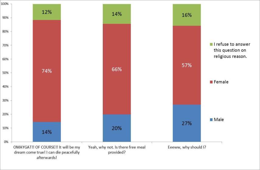 Perhatikan bahwa proporsi responden wanita yang ingin bertemu langsung dengan @newsplatter (74%) jauh lebih tinggi dari responden wanita yang gak mau bertemu (57%). Sebaliknya, responden pria yang ogah bertemu lebih tinggi dari yang semangat ingin bertemu (27% vs. 14%). Ini menunjukkan follower pria mungkin tidak seantusias follower wanita untuk bertemu langsung, foto bareng, dan candle-light dinner berdua dengan gw.