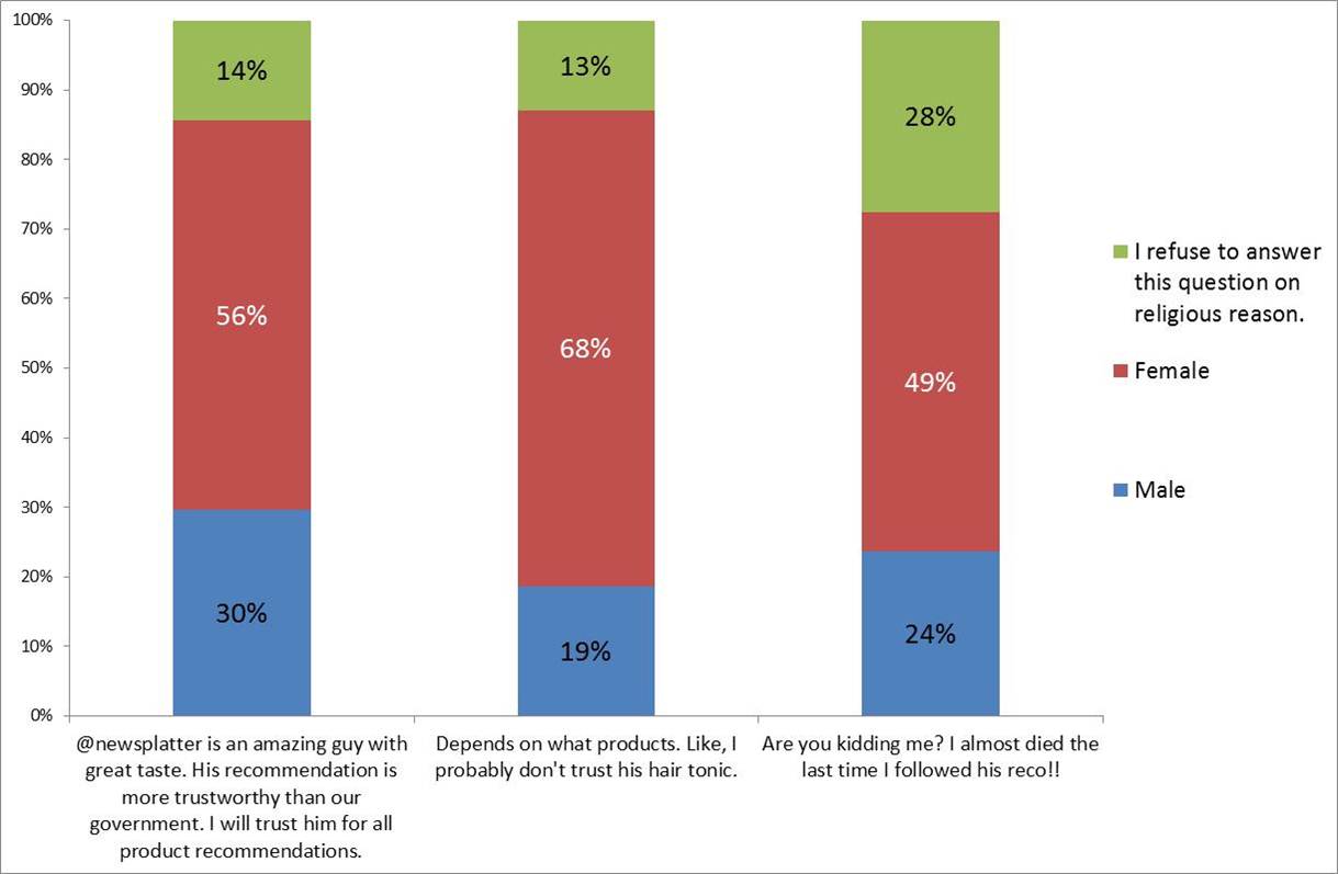Karena responden mayoritas wanita, tentunya wajar jika wanita mendominasi dalam seluruh pertanyaan. Tapi analisa tabulasi silang memungkinkan melihat ada perbedaan inklinasi. Sebagai contoh, untuk pertanyaan rekomendasi produk, perhatikan bahwa lebih banyak responden pria yang percaya pada rekomendasi produk (30% dari semua yg memilih pilihan itu), dibandingkan yang tergantung pada kategorinya dulu (19%). Hipotesanya adalah rekomendasi produk dari @newsplatter mungkin dirasakan lebih relevan bagi konsumen pria. Sebagai contoh, rekomendasi @newsplatter untuk merek bra atau alat catok mungkin kurang kredibel bagi wanita.