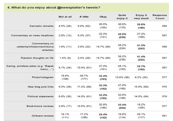 1. Waks! Aku pikir om piling cuman bercanda aja bikin survey ini, ternyata serius banget ya! Well, congrats ya surveynya sukses berat, tau gitu aku ikutan juga, ehm….tapi aku jujur suka @newsplatter karena gak mainstream gitu…..memang anak hipster sejati!