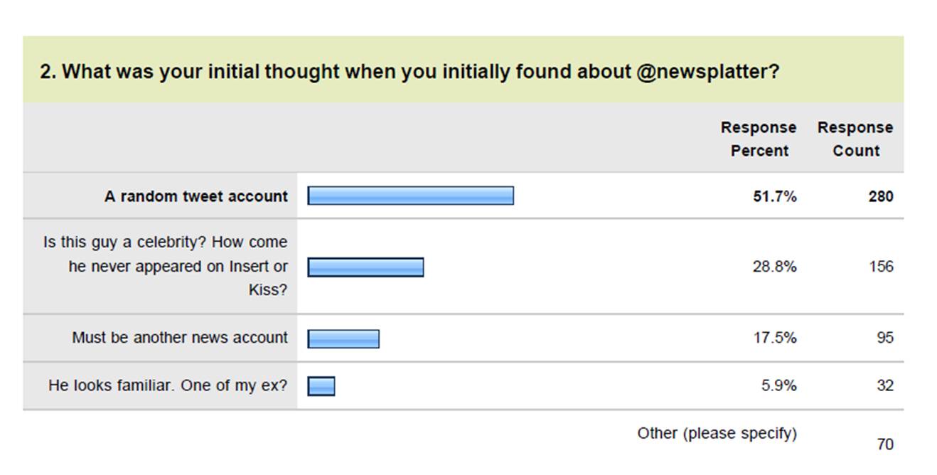 Pada awal menemukan akun @newsplatter, sekitar separuh responden menganggap ini hanyalah sebuah akun random. 28.8% sempat mengira bahwa akun ini milik selebriti. Dan tidak kecil juga yang sempat mengira ini akun berita (17.5%). Ada 5.9% yang gak tau kenapa merasa kenal atau mengira akun ini milik mantan.