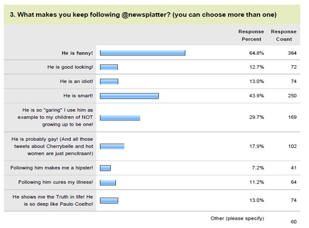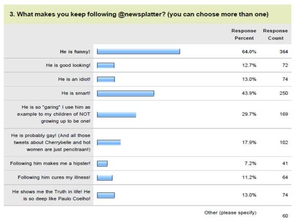 Faktor2 apa yang menyebabkan follower bertahan? Yang paling banyak adalah karena dianggap lucu (64%), dianggap cerdas (43.9%), dan dianggap garing (29.7%). Hampir 18% mencurigai @newsplatter (dan twit2 tentang Cherrybelle dan cewek2 itu hanya pencitraan). Yang luar biasa 11.2% mengakui memfollow akun ini bisa menyembuhkan penyakit, dan 13% merasa menemukan kebenaran hidup di dalamnya. Sedihnya, hampir 30% menggunakan gw sebagai pelajaran bagi anak2nya untuk tidak tumbuh besar menjadi seperti gw…..