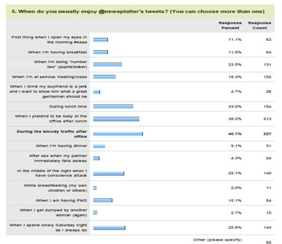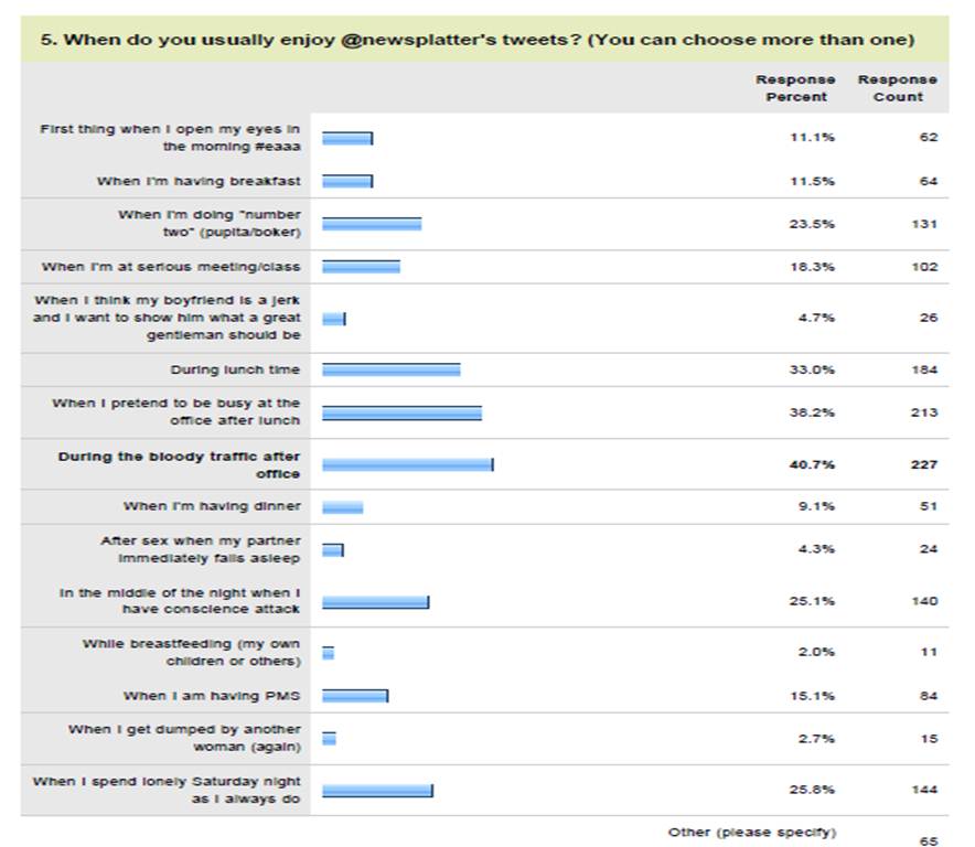 3 saat paling sering follower menikmati @newsplatter adalah saat terjebak kemacetan laknat (40.7%), pura-pura sibuk di kantor sesudah makan siang (38.2%), dan saat makan siang (33%). Selain itu saat buang air besar dan saat tengah malam ketika terbangun takut masuk neraka juga cukup tinggi (23.5% dan 25.1%). Ada 4.3% responden yang membaca @newsplatter setelah berhubungan intim ketika pasangan tertidur, dan 2% saat sambil menyusui (baik bayi sendiri maupun orang lain).