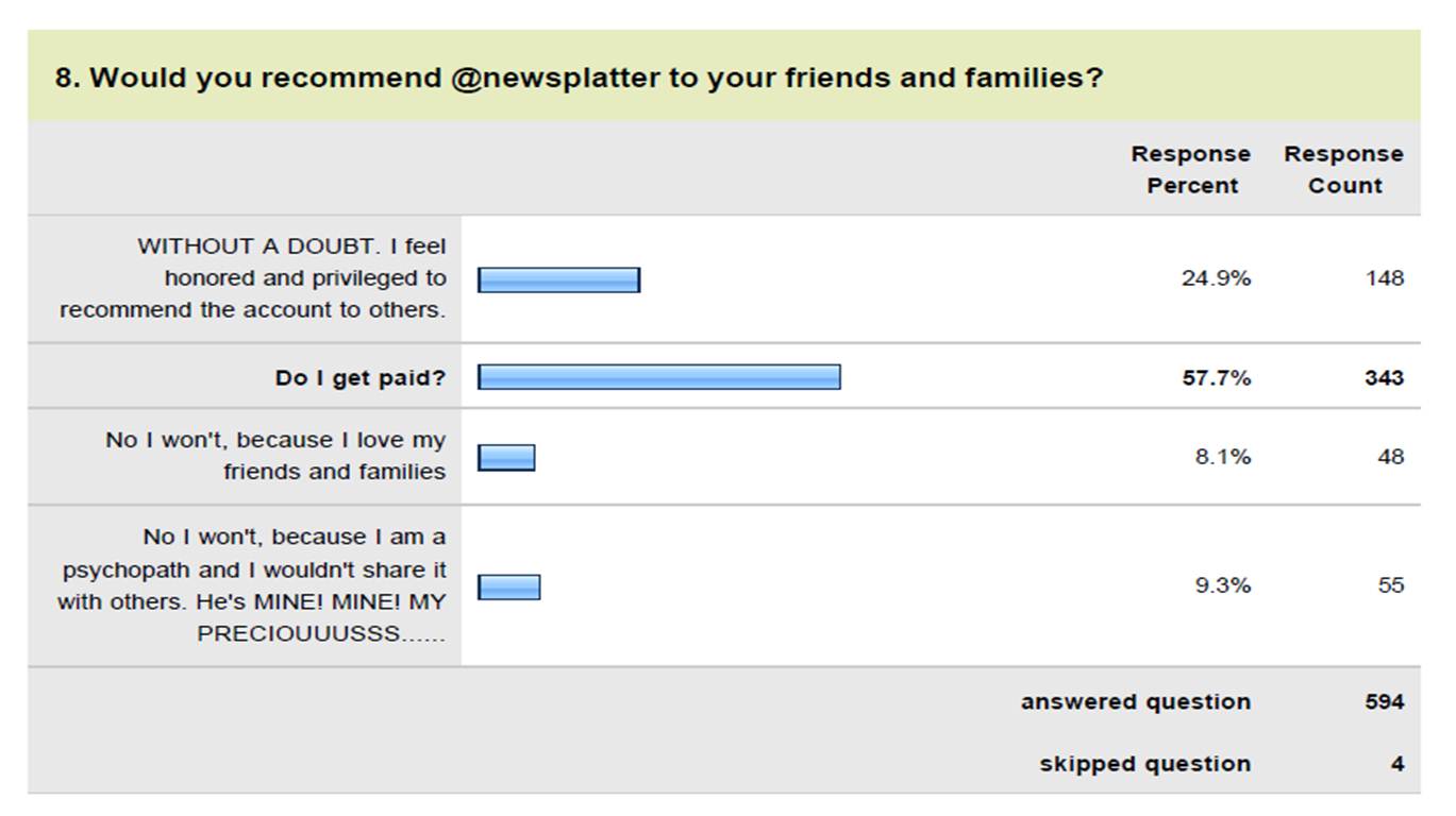 Demikian hasil dari #SurveyNewsplatter menyangkut kepuasan follower. Seluruh data akan menjadi masukan untuk peningkatan kualitas layanan kami. Selain itu, gw berharap survey sederhana ini menunjukkan ilustrasi dunia market research kepada pembaca. Siapa tahu ada yang berminat berkarir dalam dunia tersebut (semoga malah gak jadi ilfil gara2 baca ini :D)