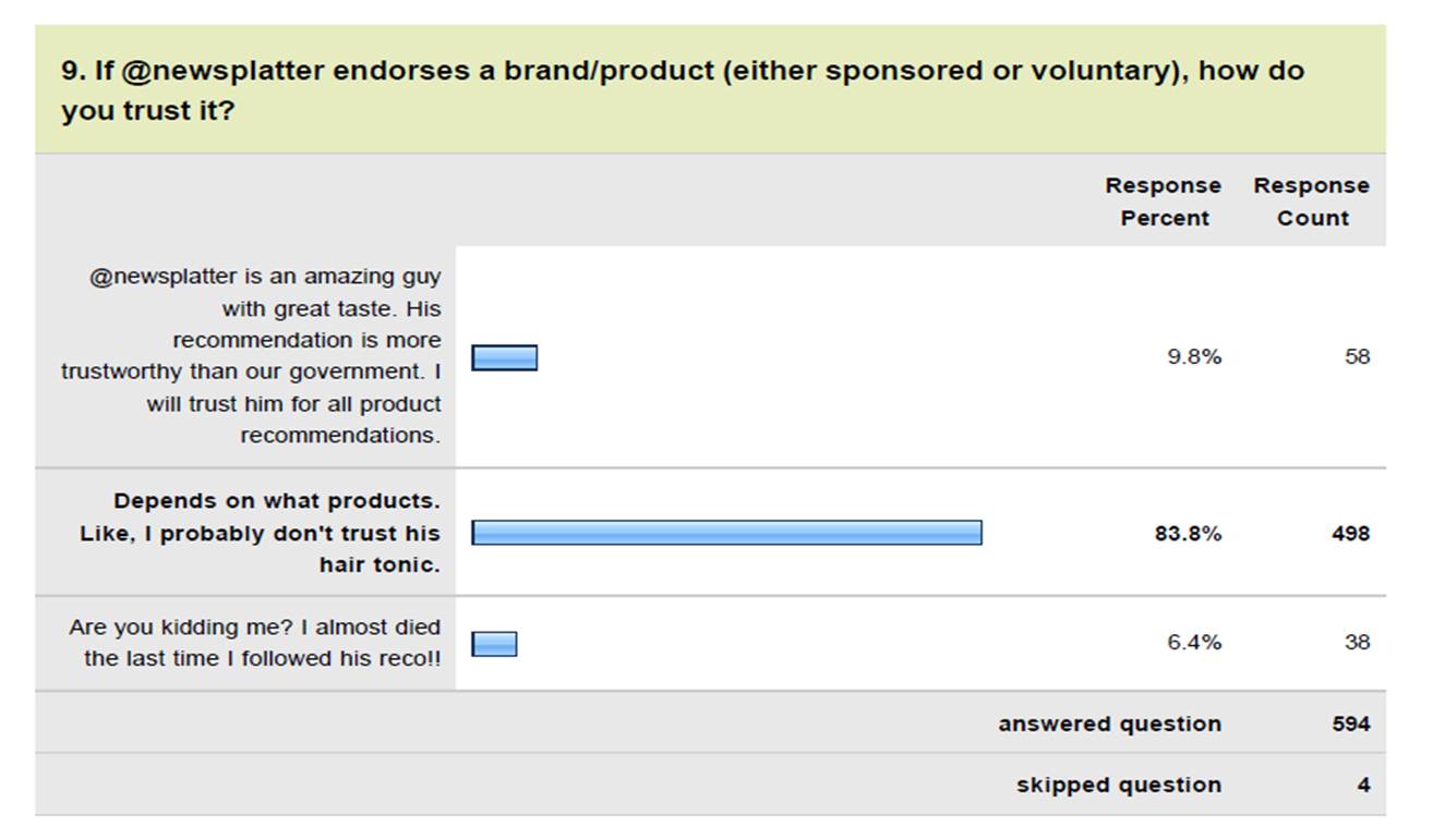 Pertanyaan 9: If @newsplatter endorses a brand/product, do you trust it?