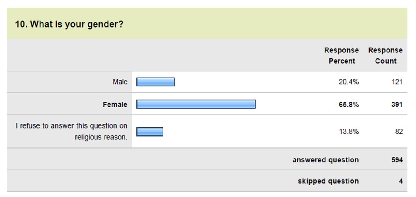 Mayoritas responden (hampir 66%) adalah wanita, 20.4% mengaku pria, sementara 13.8% menolak memberi tahu jenis kelamin karena “alasan relijius”. Data ini sedikit banyak menunjukkan profil follower akun @newsplatter (atau bisa saja pria cenderung malas mengisi survey, apalagi tanpa iming2 voucher….)