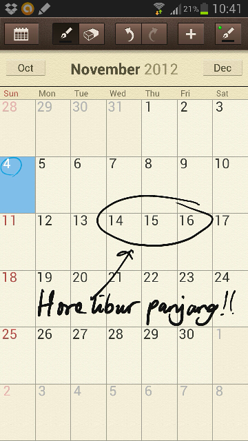 Selain untuk memo, S Pen bisa dipakai untuk banyak macam fungsi. Dari nyatet di kalender, sampai edit foto dan film! Dan kegunaan S Pen ini bener2 buanyak banget. Bayangin, kita bisa memberi petunjuk alamat dengan cara screen capture dari Google Map, kita tuliskan sendiri catatan dan panah, dan kemudian kita email ke teman kita. Praktis!