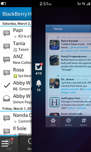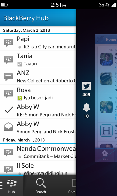 Touch gesture menjadi andalan dari BB10 experience, dan penggunaan lain adalah “peek” (ngintip). Dan ini memang literally soal ngintip-ngintipan. Maksudnya begini. Dengan BB10, saat kita lagi asyik dengan sebuah aplikasi (Twitteran, BBM-an, nonton film perjuangan, dll) dan tiba-tiba ada pemberitahuan pesan baru masuk (lampu merah kelap-kelip), kita tidak perlu menutup aplikasi yang sedang digunakan untuk mengecek pesan yang baru. Dengan gesture sama seperti membuka lockscreen, maka kita bisa melihat notification, kemudian jika jempol digeser ke kanan, maka kita masuk ke BlackBerry Hub, tempat SELURUH pesan (BBM, email, SMS, Twitter, FB, LinkedIn, dll) berkumpul. Jika kita ingin langsung membalas, bisa. Tetapi jika kita mikir “Ah males, dari mantan”, jempol tinggal kita geser ke kiri, dan kita kembali ke aplikasi awal. Dan sepanjang kita melakukan ini semua, aplikasi awal tadi berjalan terus, tidak ter-close.