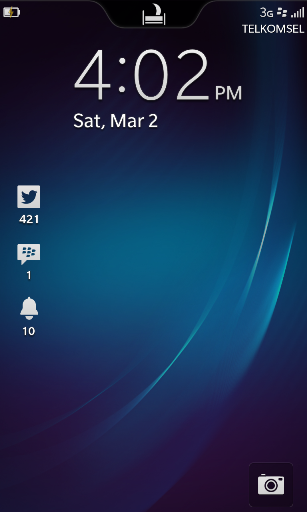 Jadi bagaimana dong unlocknya? Caranya adalah jempol digosok dari tulisan BlackBerry di bawah, ke arah atas. Maka lock screen akan “tersingkap” (kayak buka rok gitu) ke arah atas. Tinggal di”sentil” ke atas, maka lock screen akan terbuka. Inilah salah satu penggunaan “touch gesture” dari BB10, dan masih banyak lagi penggunaan lainnya.
