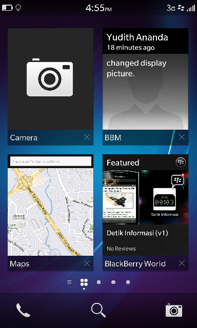 BB10 mampu menjalan sampai 8 aplikasi secara simultan. Jika kita ingin berganti aplikasi, maka aplikasi yang sedang kita gunakan cukup “disentil” ke atas, dan kita akan sampai ke running applications page. Tinggal pilih ingin pindah ke aplikasi yang lain.