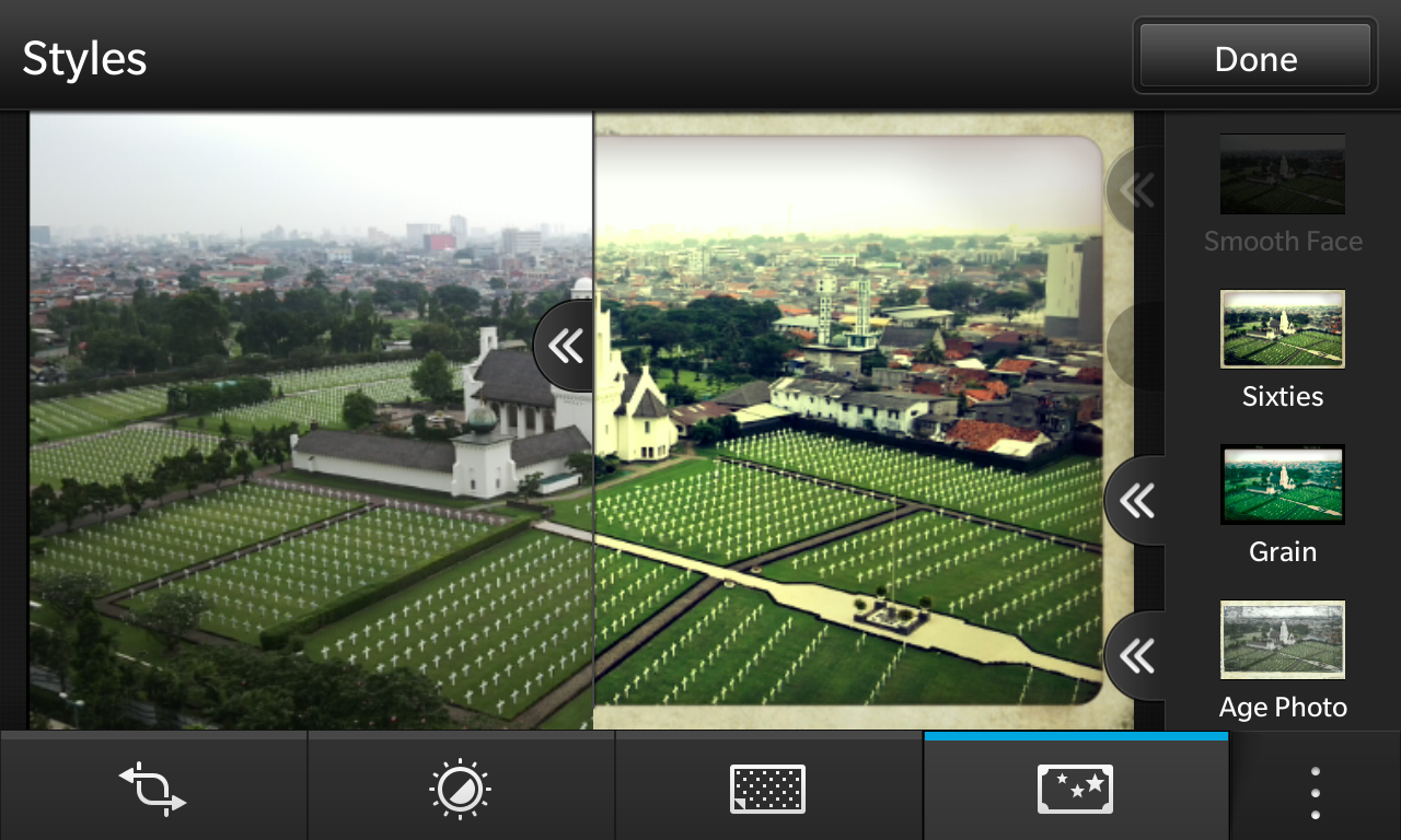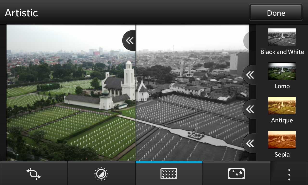 Fasilitas built-in photo editing. Z10 sudah memiliki fasilitas photo editing built-in yang menurut gw cukup bagus. Kita bisa melakukan cropping, mengapply filter, mengubah brightness/contrast, dan creative tools lain. Yang gw suka adalah cara mengaplikasikan yang unik. Pengalaman gw di Android, kalau kita menggunakan filter, maka foto langsung “berubah” menggunakan filter tersebut. Di Z10, filter bisa di-slide, sehingga kita bisa membandingkan antara sebelum dan sesudah, digeser2 sesuka hati. Walaupun terkesan sepele, tetapi kalo dicoba sendiri menyenangkan deh.