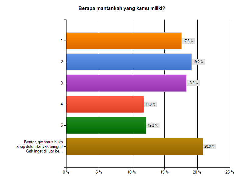 Lebih dari separuh responden memiliki mantan antata 1-3 orang. Ada 20.9% responden yang belagu banget mengklaim punya mantan lebih dari 5 orang. Hih.