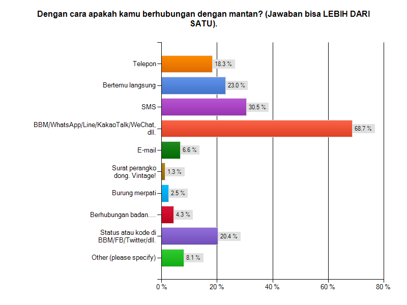 Chatting (BBM, WhatsApp, Line, dll) adalah medium berhubungan dengan mantan yang paling populer (68.7%). Disusul SMS (30.6%). Ternyata “bertemu langsung” juga cukup populer, dipilih seperlima responden. Status atau “kode” yang ditaruh di status BBM/FB/Twitter ternyata juga cukup diandalkan untuk mengirim pesan pada mantan (20.4%).