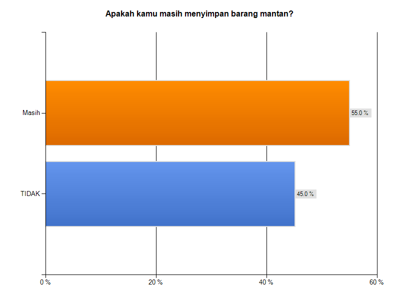 Sedikit catatan tentang interpetasi hasil. Karena survey ini bukan survey yang “ilmiah” banget, maka gw merasa perlu memberikan sedikit catatan. Dalam menginterpretasi temuan di bawah, agar pembaca jangan menggeneralisir hasilnya sebagai realita “seluruh orang”. Hal ini dikarenakan metode survey online yang belum tentu representatif dari total populasi. Contoh: data bahwa 50% lebih responden masih menyimpan barang dari mantan. Kita tidak bisa serta-merta menyimpulkan separuh masyarakat menyimpan barang dari mantan, tetapi lebih tepat “separuh responden yang mengikuti survey ini menyimpan barang dari mantan”. Jelas gak sih? Jelas dong.