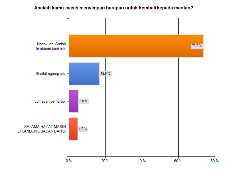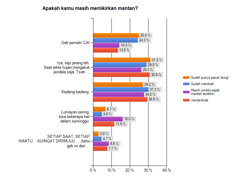 19.3% mengaku nista untuk memikirkan mantan. Berarti 80% lebih responden mengakui memikirkan mantan, walaupun dalam frekwensi yang berbeda-beda. 28.4% mengaku jarang memikirkan mantan, hanya saat tetes hujan mengetuk jendela saja (hoek! cuh!) 35% mengaku kadang-kadang saja. 11.2% bisa memikirkan mantan beberapa kali seminggu. Ada 6.2% yang masih kepikiran setiap saat, setiap waktu, kuingat dirimu (tau gak ini dari lagu apa?).