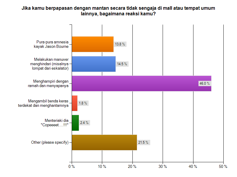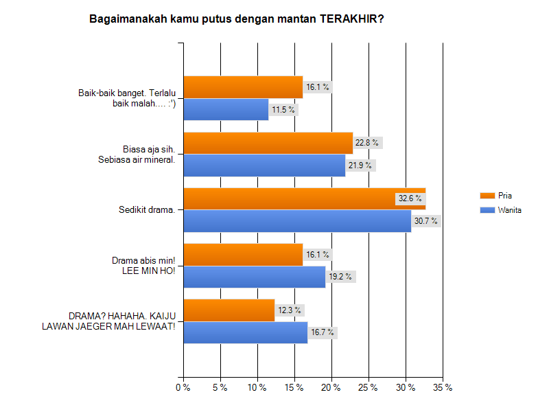 Hampir separuh responden (48.5%) mengaku putus dengan mantan terakhir dengan sedikit drama atau drama abis. 16.2% mengklaim putusnya mereka yang terakhir lebih dahsyat dari pertempuran Kaiju lawan Jaeger (yang kagak ngerti, nonton dong Pacific Rim! Gaoel men, gaoel!). Berarti hampit 1 dari 2 responden putus dengan mantan terakhir dengan adanya tegangan emosional. Hanya 13% responden yang mengklaim putus yang sangat baik-baik (kayak apa ya putus baik-baik banget? Sambil lari-lari di bukit rumput gitu kali ya?).