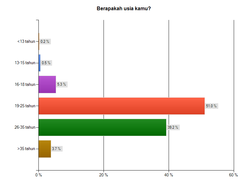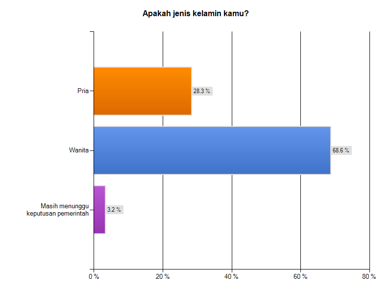 Survey kali ini berhasil mengumpulkan lebih dari 4,403 entry, dan 3,383 dari itu menyelesaikan seluruh kuesioner (jadi tingkat penyelesaian 76.8%). Mengapa ada sekitar 1,000 responden yang “tidak selesai”? Yang pertama, 388 responden terdiskualifisir ketika mereka menyatakan tidak punya mantan di pertanyaan pertama. Sisanya, somehow memulai survey tetapi tidak sampai selesai. Penyebabnya bisa bermacam2: gangguan koneksi, di tengah jalan disuruh bobo sama emak, atau tidak kuasa menahan kenangan indah itu dan memutuskan berhenti di tengah jalan.