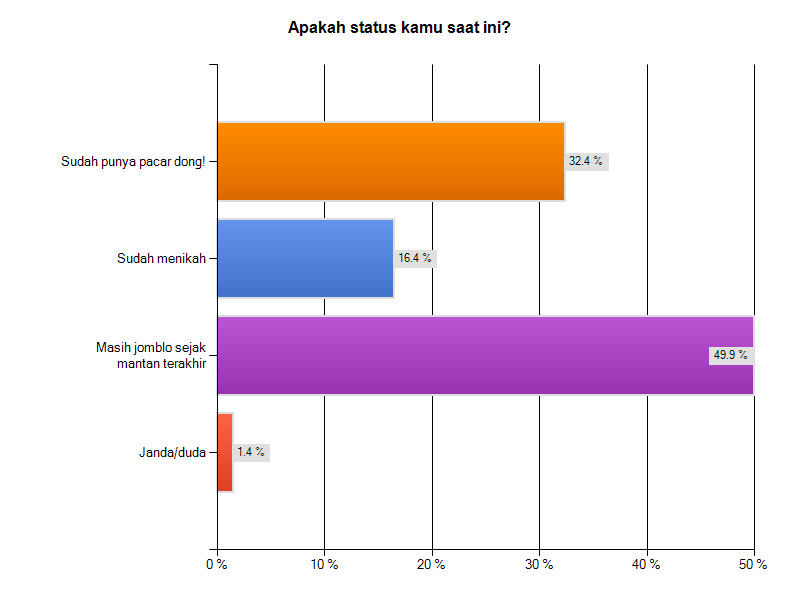 50% responden ternyata MASIH MENJOMBLO sejak berpisah dari mantan terakhir. 16.4% sudah menikah, dan hampir sepertiga mengaku sudah mempunyai pacar baru. Mengapa banyak jomblo yang mengikuti survey ini? Mungkin karena survey diluncurkan Sabtu malam, jadi yang bisa mengikuti ya hanya yang jomblo. Yang punya pacar terlalu sibuk pacaran juga ya. Jadi salah satu berkah menjadi jomblo adalah, kalian bisa disurvey! Lho…