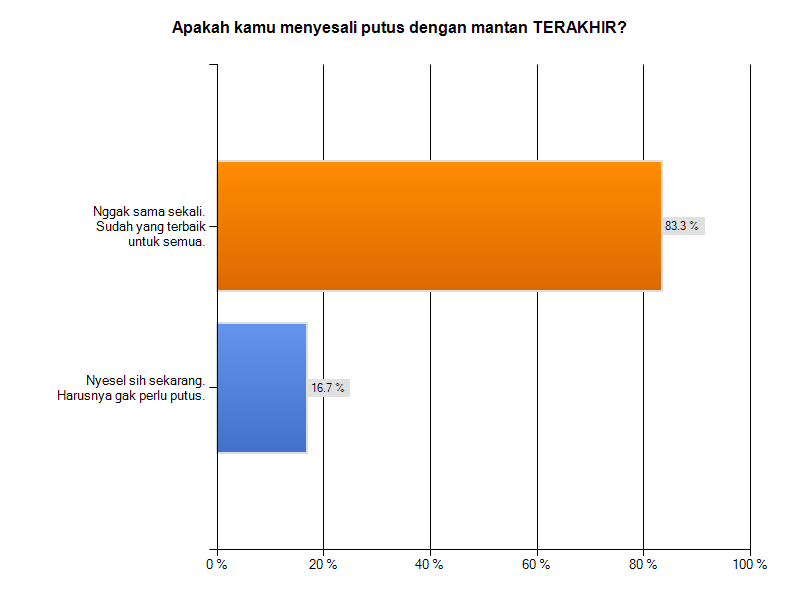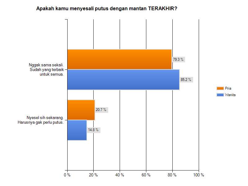 Soal penyesalan putus dari mantan, Perhatikan di antara responden yang menyesal putus, lebih banyak dari responden jomblo. Ini menurut gw karena simply para jomblo belum ketemu pacar lagi aja. Kalo udah ketemu juga nanti lupa. Bener kata pepatah, “The best way to get over someone is to get under someone” (eh….)