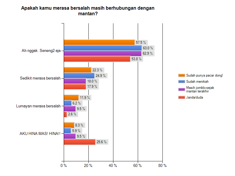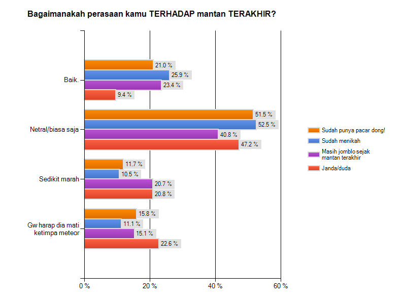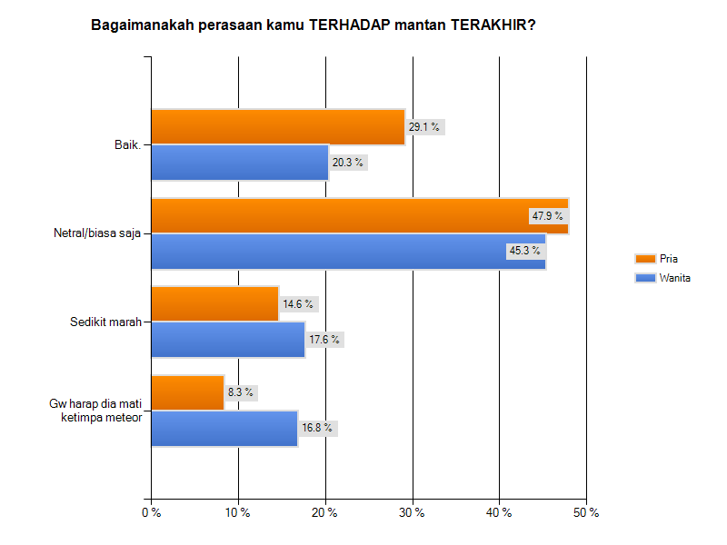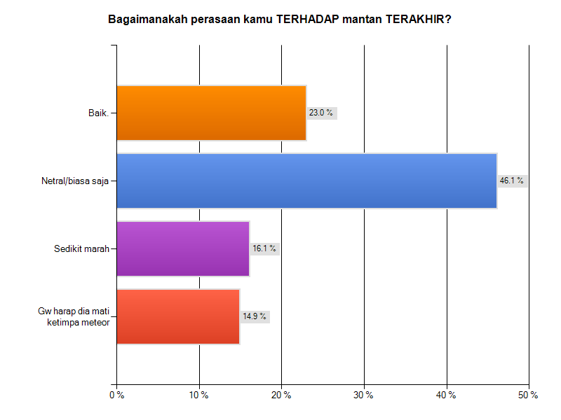 Sekitar seperlima responden mengaku perasaan terhadap mantan terakhir “baik”/positif. Hampir separuh (46.1%) merasa “netral”. 16.1% masih merasa sedikit marah, dan 15% mendoakan sang mantan tertimpa benda angkasa yang kebetulan mengarah ke bumi. Berarti, lebih dari 30% responden sebenarnya masih menyimpan perasaan tidak enak terhadap mantan!
