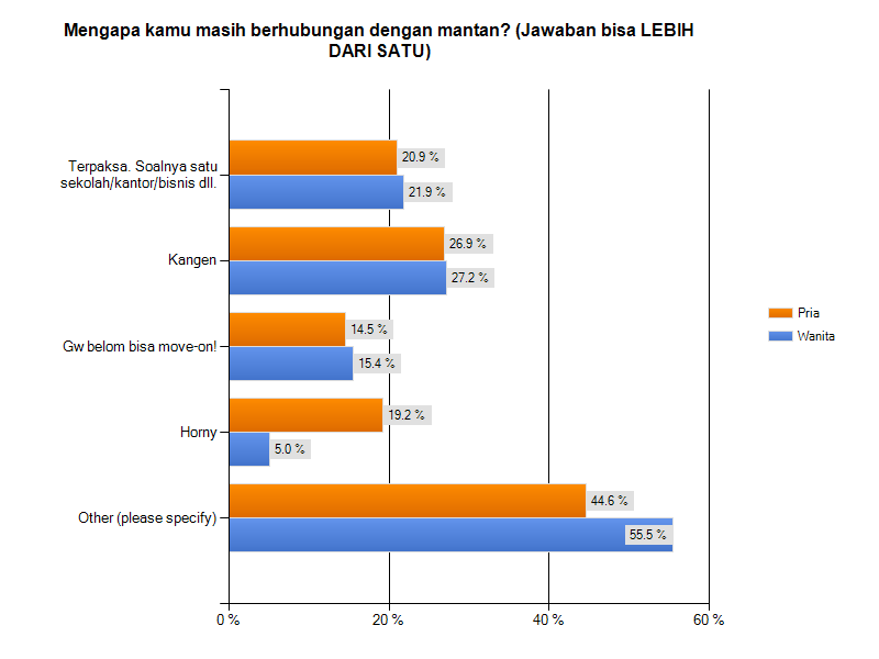 Perhatikan untuk alasan berhubungan dengan mantan karena horny, jumlah responden pria hampir EMPAT KALI responden wanita, Laki2 memang bajingan semua! HIH.