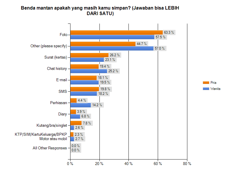 Soal benda mantan yang masih disimpan, lebih banyak pria menyimpan foto daripada wanita. Sebaliknya, lebih banyak wanita yang menyimpan chat history. Pelajaran buat cowok2: kalo nyepik cewek pake chatting, ati2 disave historynya :D. Oh iya, pria juga 3x lebih banyak menyimpan kutang/bra mantan daripada wanita. Kenapa ya?