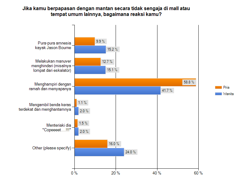 Soal reaksi saat berpapasan dengan mantan di mall/tempat umum lainnya, ternyata lebih banyak pria yang akan menghampiri dan menyapa dibanding wanita (58.8% vs. 41.7%). Sebaliknya, wanita yang akan pura2 amnesia seperti Jason Bourne atau melompat dari eskalator berjumlah jauh lebih banyak dari pria. Lebih banyak juga wanita yang akan mencari benda keras dan menggampar si mantan. Kesimpulan buat pria: hindari bertemu mantan di toko2 hardware, seperti Ace Hardware.