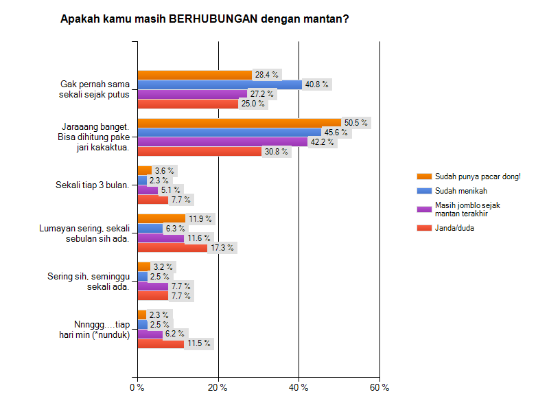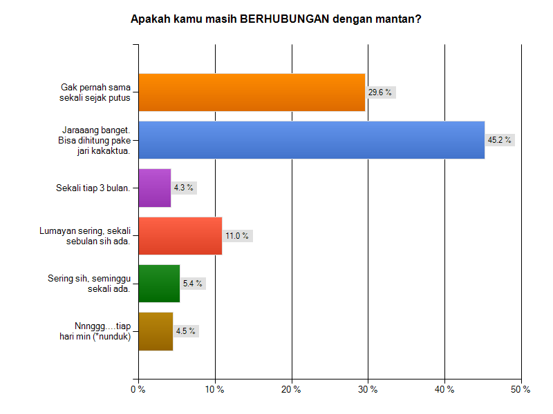 Hampir 30% responden mengaku TIDAK berhubungan dengan mantan sama sekali sejak putus, yang berarti sisanya 70% masih berhubungan dengan mantan dengan intensitas berbeda-beda. Kelompok terbesar adalah yang mengaku masih berhubungan tetapi sangat jarang (45.2%). Ada 4.5% yang bahkan berhubungan mantan SETIAP HARI.