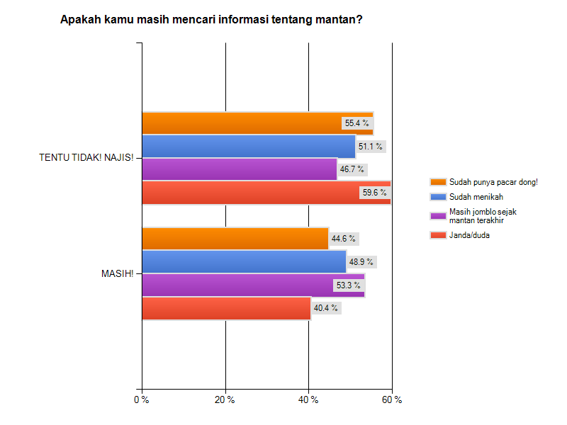 Soal masih mencari informasi mantan, proporsi terbanyak ada di antara kaum jomblo. Begitulah kalau jomblo, bukannya mengerjakan hal berguna seperti membersihkan gorong-gorong, malah mencari informasi soal mantan. HIH!