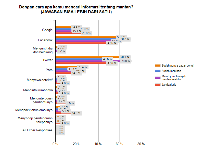 Metode terbanyak menggali info tentang mantan adalah melalui Twitter (66%), disusul Facebook (56.2%). Ada 4.6% orang yang mengaku menghack akun email mantannya (high-tech juga nih). Beberapa cara lain mencari informasi mantan adalah (dari open-ended):