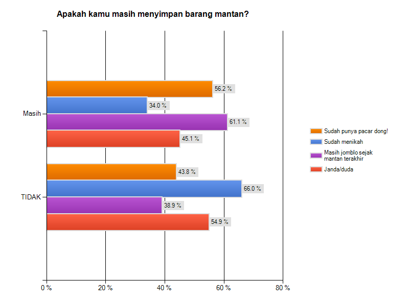 Soal menyimpan barang mantan, ada perbedaan menarik. Proporsi terbesar penyimpan barang mantan adalah jomblo, dan proporsi tersedikit adalah yang sudah menikah. Memang sudah sebaiknya sih, kalau menikah tidak menyimpan barang mantan. Tetapi patut dicatat bahwa masih ada sepertiga responden menikah yang menyimpan barang mantan. Proporsi penyimpan barang mantan di antara yang sudah pacaran pun relatif tinggi (56.1%).