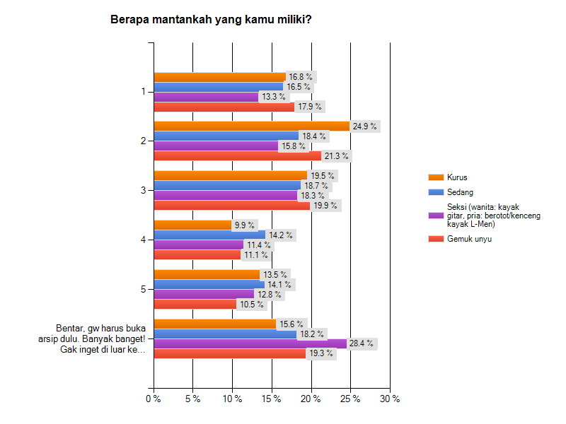 Mereka yang memgaku punya bada seksi ternyata memiliki proporsi tertinggi memiliki mantan lebih dari 5. Kesimpulan: untuk punya banyak mantan, milikilah body seksi!