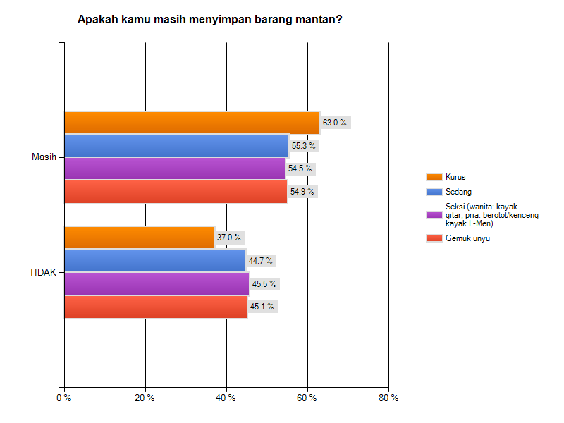 Soal menyimpan barang mantan, pertanya proporsi tertinggi ada di antara responden kurus. Kenapa ya? Untuk tambahan gizi kali ya?