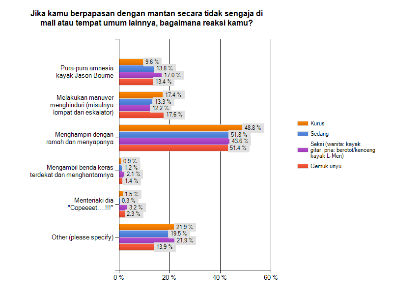 Soal reaksi saat berpapasan dengan mantan, entah mengapa lebih banyak proporsi responden seksi yang memilih amnesia dibanding bentuk tubuh lain. Yang aneh lagi, proporsi yang kurus DAN gemuk unyu yang memilih manuver menghindar lebih tinggi dari yang lain. Mungkin karena yang kurus dan gemuk unyu merasa lebih mudah bersembunyi? Responden yang seksi yang juga lebih banyak yang memilih mencari benda keras untuk menggampar mantan. Mungkin karena mereka merasa merasa fit dan body fitness?
