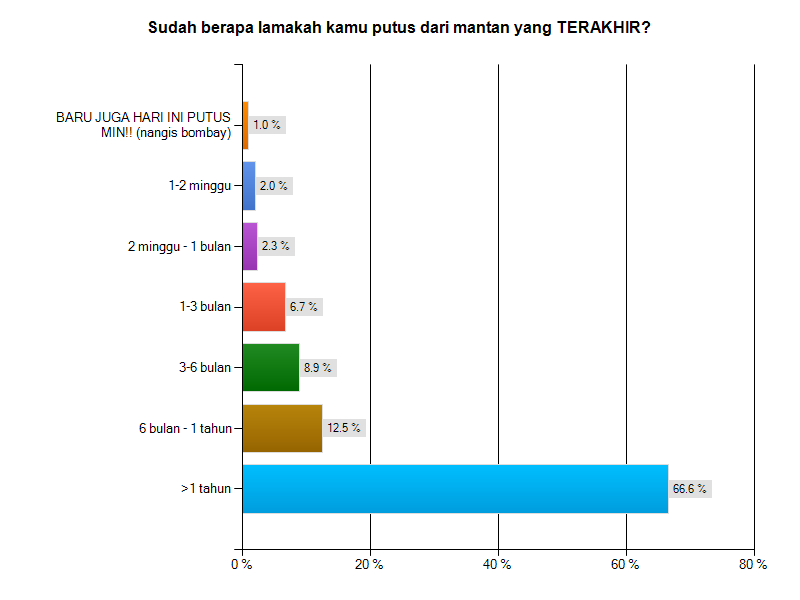 Dua pertiga responden mengklaim sudah putus dari mantan terakhir lebih dari setahun. 1% dari responden mengaku baru putus di hari yang sama dengan mereka mengerjakan survey ini. Astaga! Semoga survey ini bermanfaat dalam membantu proses transisi menuju Jomblo Baru Sejahtera.