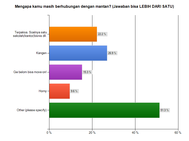 Seperlima (22.2%) mengaku berhubungan karena kondisi terpaksa (satu sekolah/kantor, atau situasi2 memaksa lain). 27% jujur mengaku masih kangen. Hampir 10% mengaku karena horny/nepsong. Tetapi yang terbanyak justru untuk alasan-alasan lainnya. Sebagian dari alasan-alasan itu (dari jawaban open-ended):