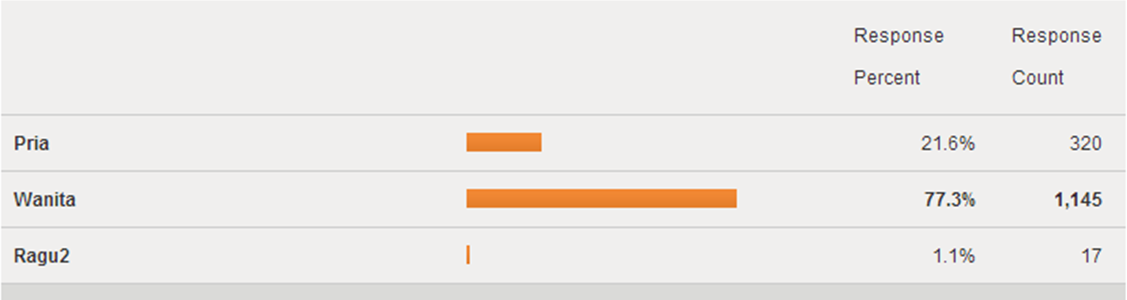Responden Survey Kepuasan Pasangan 2014 ini didominasi oleh wanita (77%). Hal ini patut diingat untuk mengerti konteks jawaban-jawaban di atas.