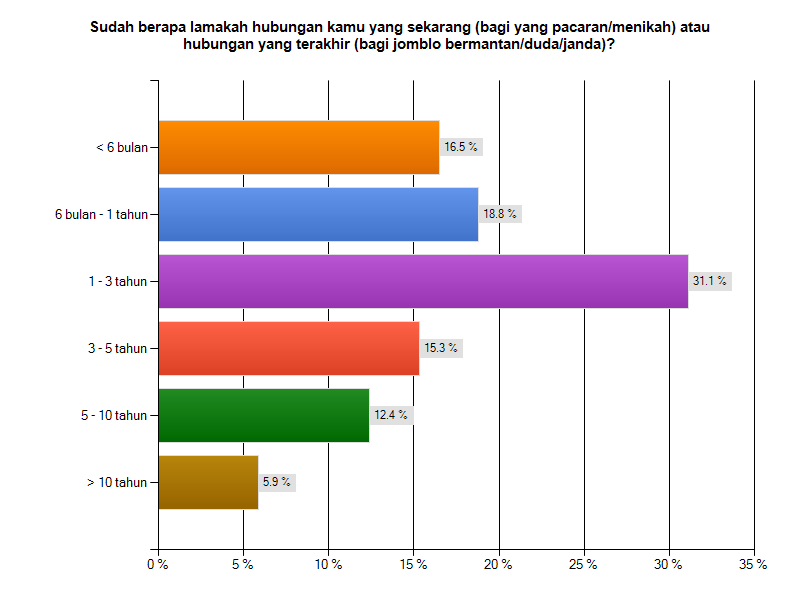 Lama hubungan responden, hampir sepertiga berada di 1-3 tahun. Sepertiga lagi kurang dari setahun, dan kira2 sepertiga lagi lebih dari 3 tahun.