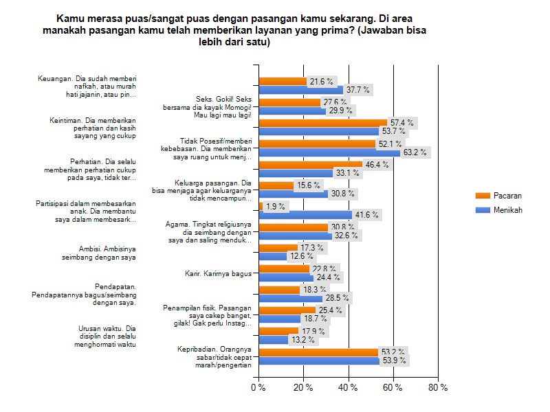 Sebenarnya hasil ini positif, karena proporsi mereka yang “puas” dan “sangat puas” akan pasangan mereka adalah mayoritas (total 65.9%). Di sisi lain, kita bisa juga melihat ada 34% responden yang tidak memilih “puas” atau “tidak puas” (paling mentok “sedang”), atau satu dari tiga responden tidak merasa puas akan pasangannya. Angka ini sebenarnya tidak bisa dibilang kecil ya.