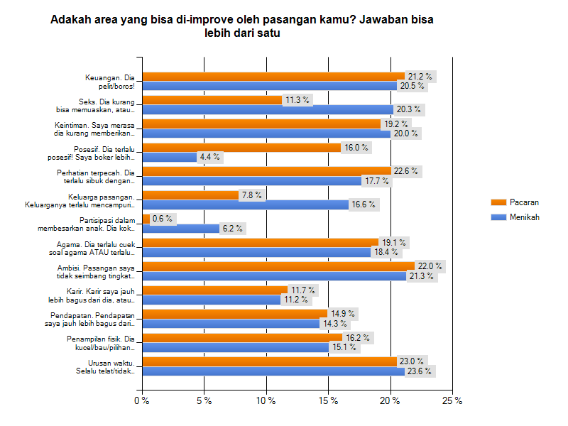 Bagi mereka yang sudah puas dengan pasangannya, area yang bisa diimprove relatif cukup merata, tidak ada yang dominan sekali. Beberapa faktor yang disebutkan, baik mereka yang pacaran/menikah, adalah: urusan waktu, keseimbangan ambisi, agama, campur tangan keluarga (bagi yang menikah), perhatian yang terpecah dengan pekerjaan/hobi, masalah posesif (bagi yang pacaran), keintiman, seks (bagi yang sudah menikah), dan keuangan (terlalu pelit/boros). Tetapi intinya tidak ada yang sangat dominan. Rata-rata area untuk diimprove dipilih dalam kisaran 20%-an.