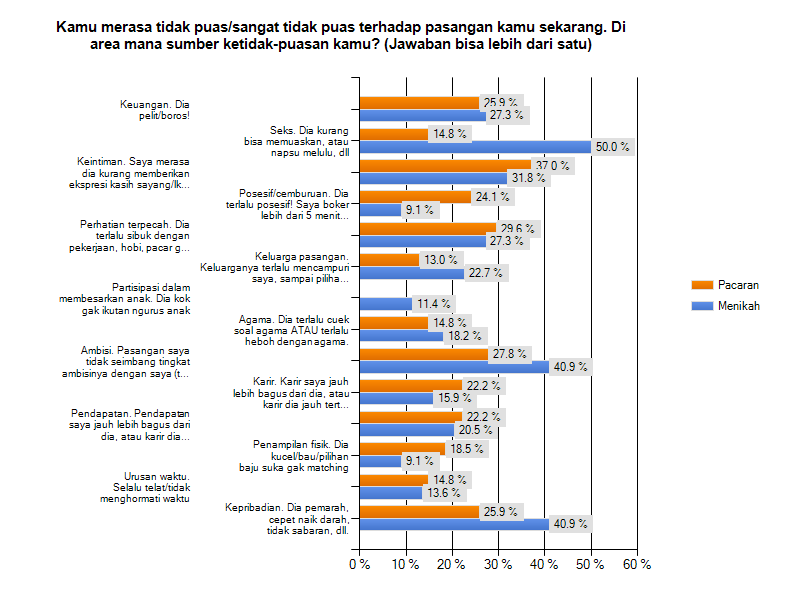 Ada perbedaan penyebab ketidak-puasan antara responden pacaran dan menikah. Bagi yang pacaran, yang terbanyak dipilih adalah: keintiman (ekspresi kasih sayang di luar seks), sebesar 37%. Penyebab kedua terbesar adalah perhatian yang terpecah (pasangan terbagi perhatian dengan pekerjaan, hobi, pacar gelap, dll.) sebesar 29.6%, dan ketiga adalah kepribadian (pemarah, tidak sabaran) dan keuangan (pelit/boros), masing2 sebesar 25.9%. Perhatikan bahwa keuangan (entah itu pelit atau boros) juga menjadi pilihan yang tinggi (25.9%).
