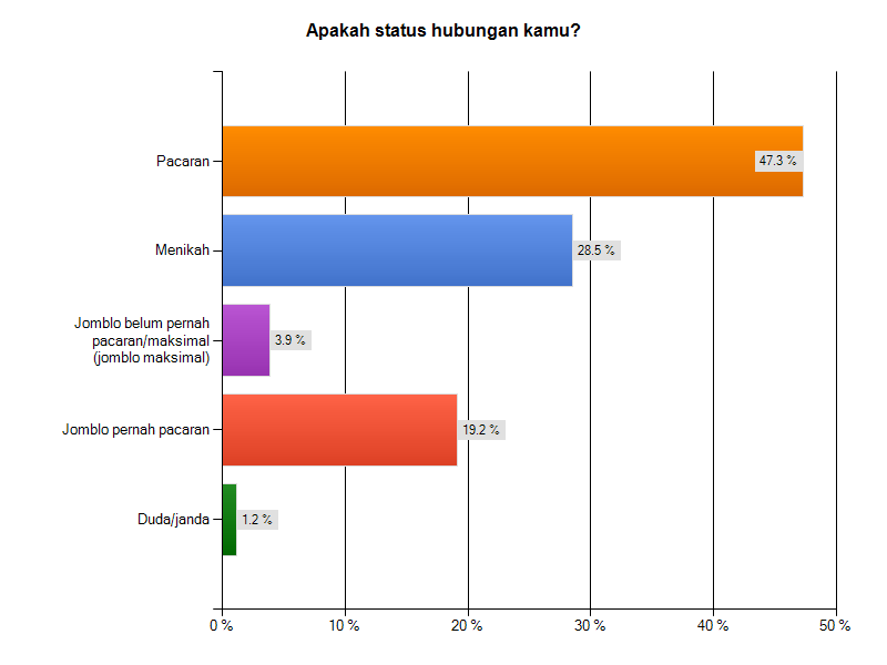 Hampir separuh responden berstatus pacaran (47.3%), diikuti menikah (28.5%). Jomblo pernah pacaran ada 19.2%.