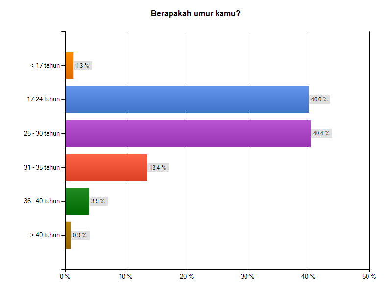 Sedikit catatan mengenai interpretasi: Karena survey ini bukan survey yang “ilmiah” banget, maka gw merasa perlu memberikan sedikit catatan. Dalam menginterpretasi temuan di bawah, mohon pembaca jangan menggeneralisir hasilnya sebagai realita “seluruh orang”. Hal ini dikarenakan metode survey online yang belum tentu representatif dari total populasi. Jadi lebih tepat menginterpretasikan hasil berikut sebagai hasil dari “para peserta survey yang diadakan @newsplatter”, dan bukan menggambarkan “penduduk Indonesia”. Jelas yaaaa…..