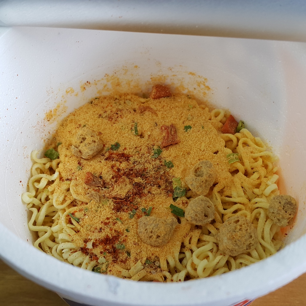 Sesudah 3 menit, maka Pop Mie Kari Susu bisa dinikmati. Setelah gw aduk, tambahan susu bercampur/larut merata dengan dengan kuah kari. Rasanya sedikit lebih creamy dari kuah kari biasa, dan cukup enak bagi gw. Walaupun jujur, gw tidak merasa “kaget” seperti saat memakan rasa Kari Keju. Gak tahu deh kalo lagi makan Pop Mie Kari Susu ini tiba2 dijepit Duo Serigala, mungkin bisa tambah kaget.