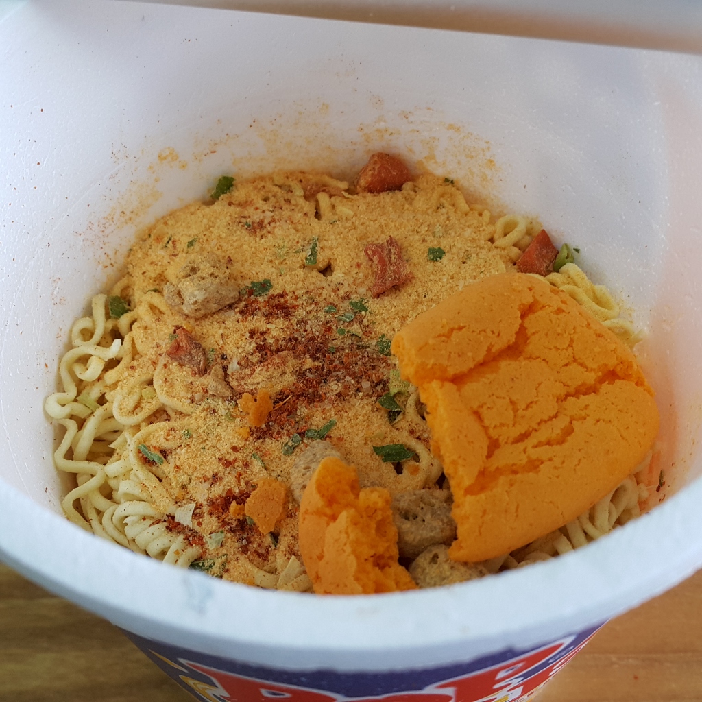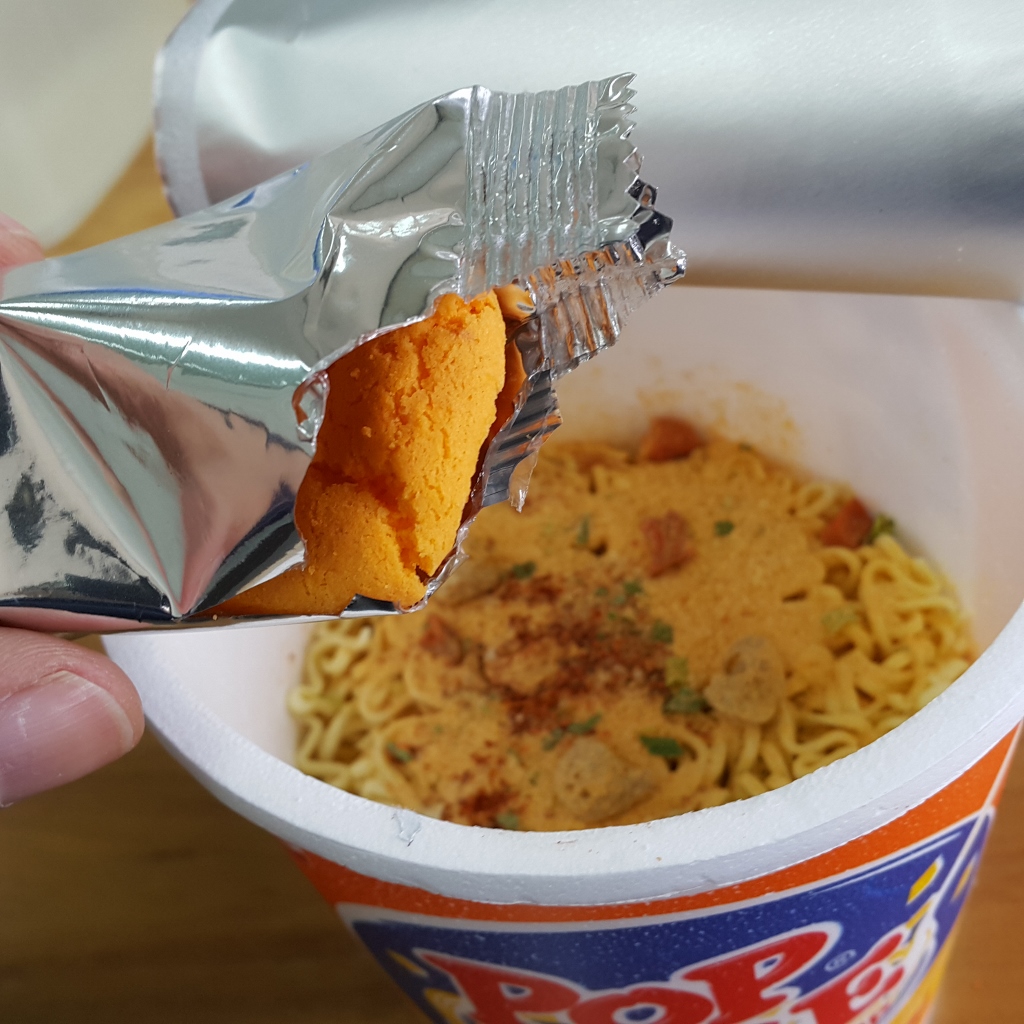 Dari luar, tidak ada yang spesifik dari kemasan Pop Mie Kari Susu. Hanya warna dominan biru dan deskripsi “Rasa Kari Susu”.