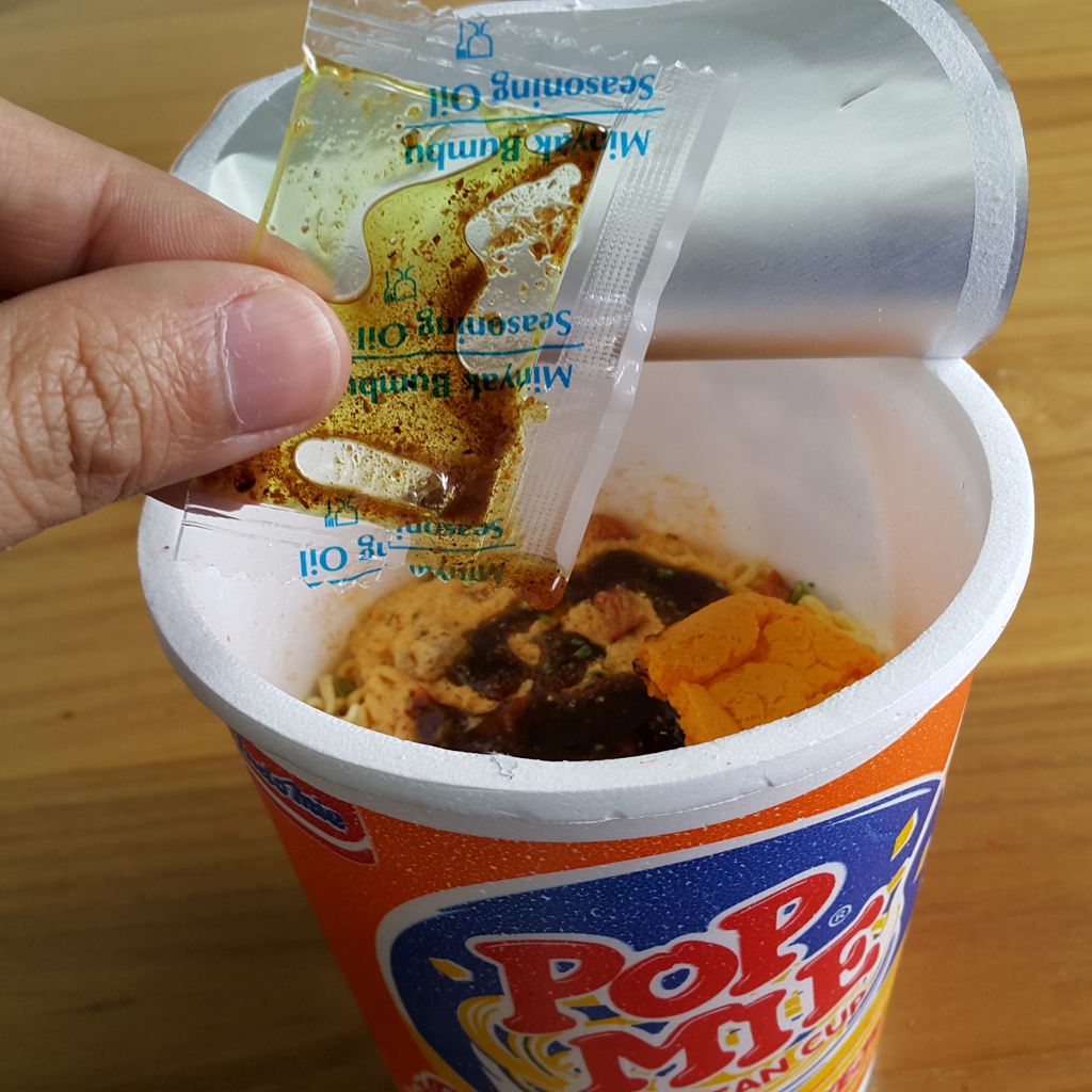 Buka seluruh sachet berisi bumbu dan cabe bubuk, tuangkan seluruh isi ke dalam kemasan Pop Mie.